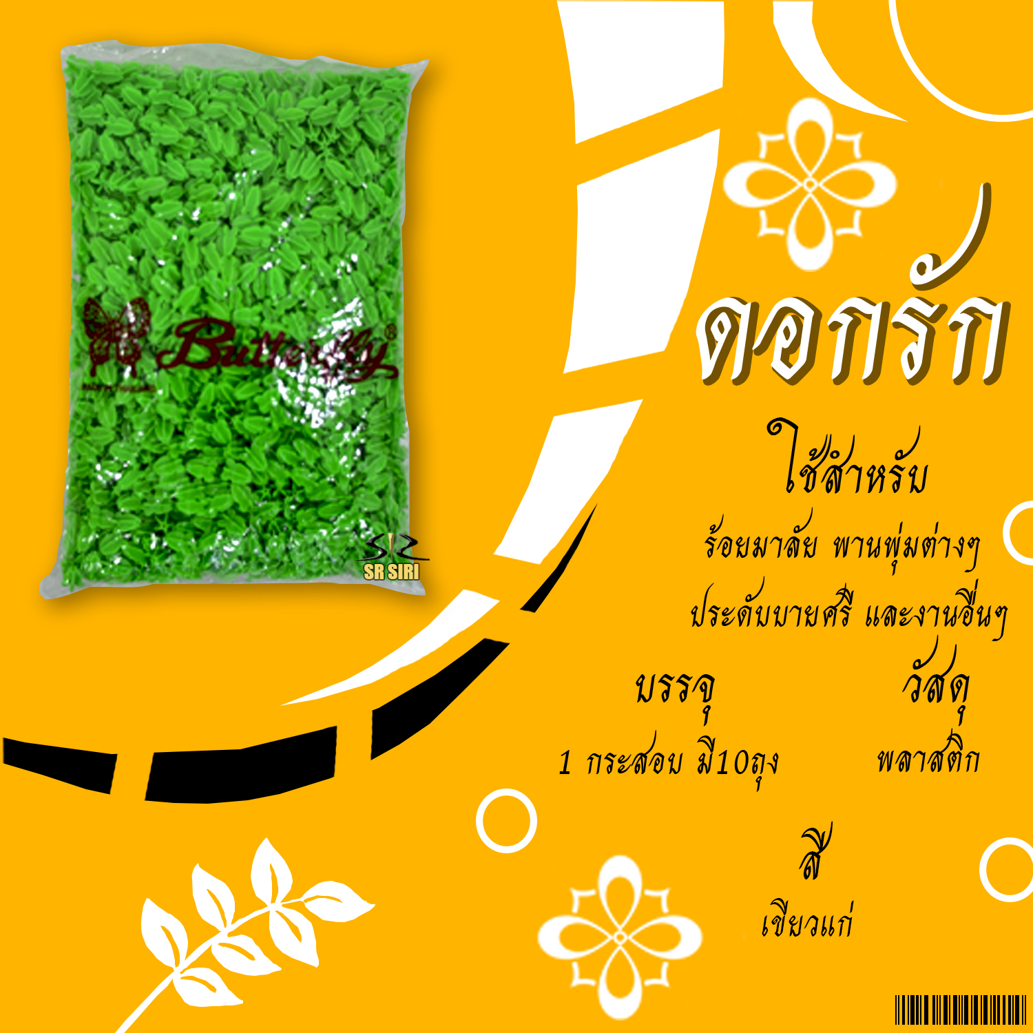 หน้าแรก > พวงมาลัย > ดอกรัก ตราผีเสื้อแดง สีเขียวแก่