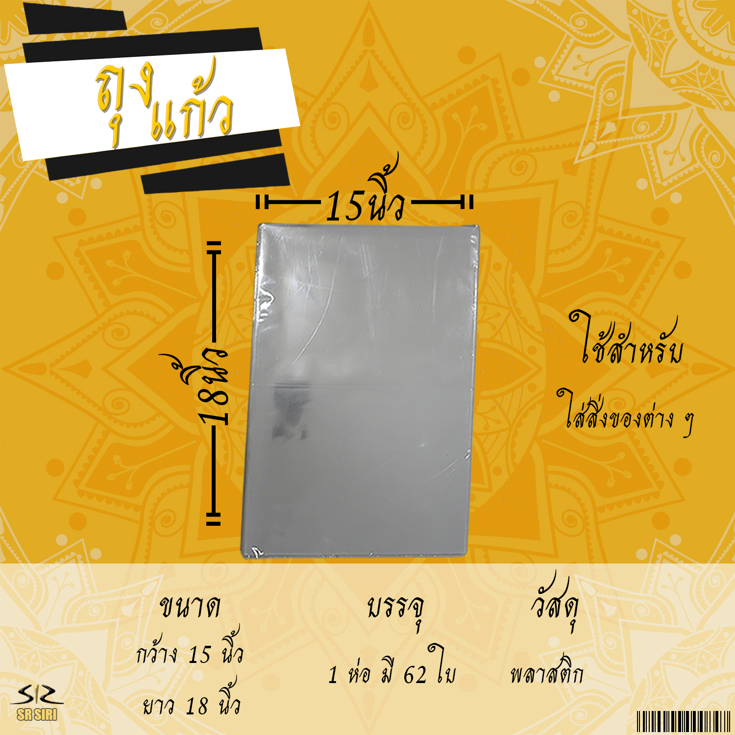 หน้าแรก > วัตถุดิบผลิตสินค้า > ถุงแก้ว ไซด์ 15x18 นิ้ว 1/62ใบ