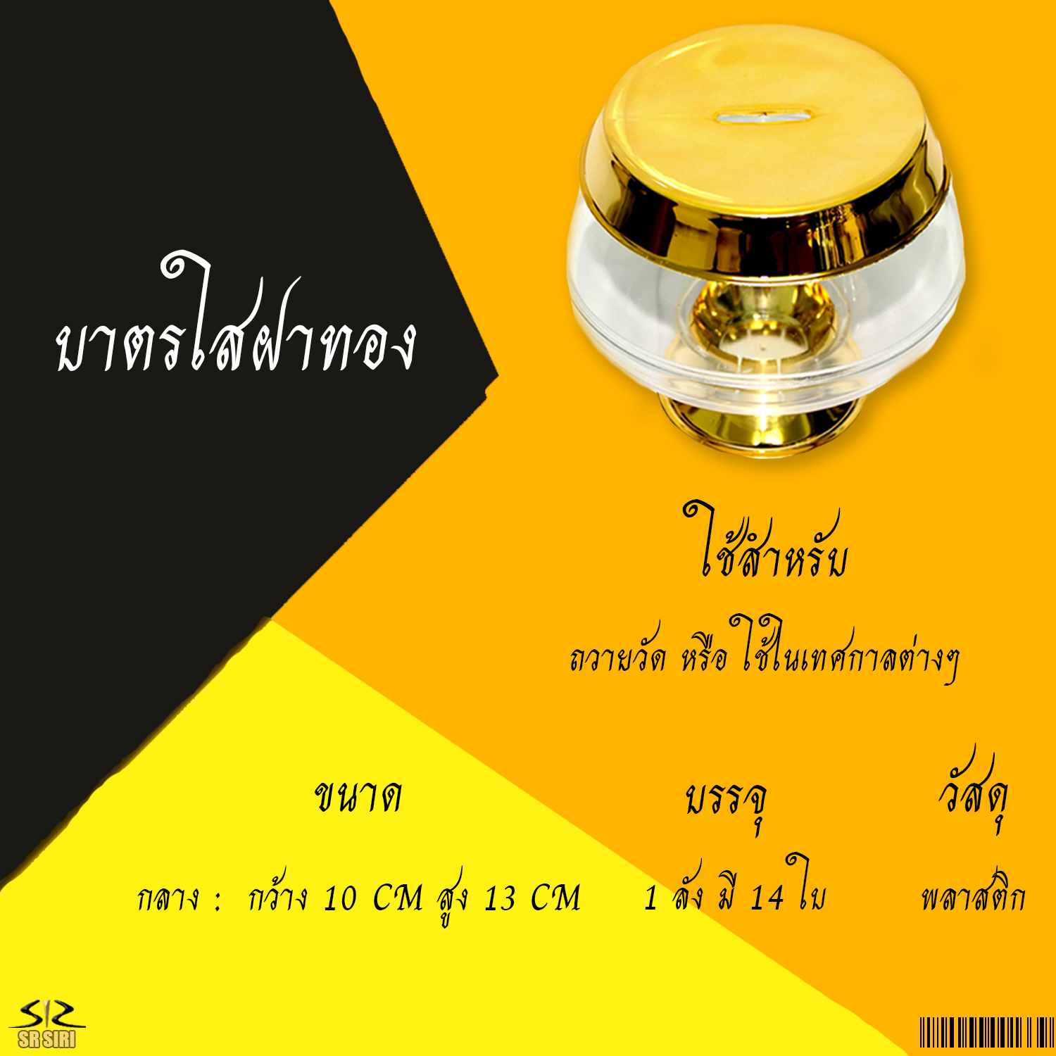 หน้าแรก > พลาสติก > บาตรใสฝาทอง ไซด์ กลาง 1/24ใบ