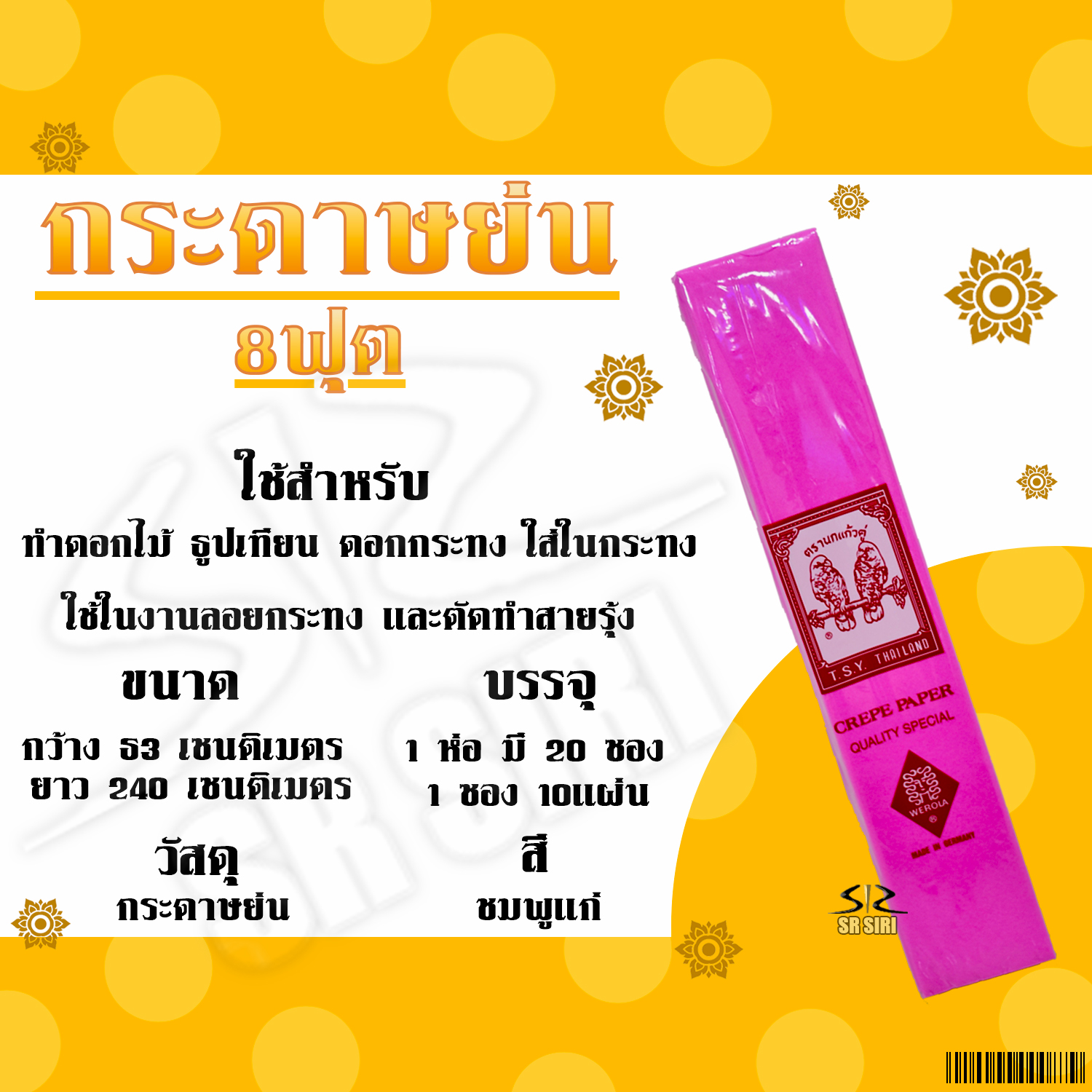 หน้าแรก > กระดาษ > กระดาษย่น 8ฟุต สีชมพูแก่ 033 1/20ซอง