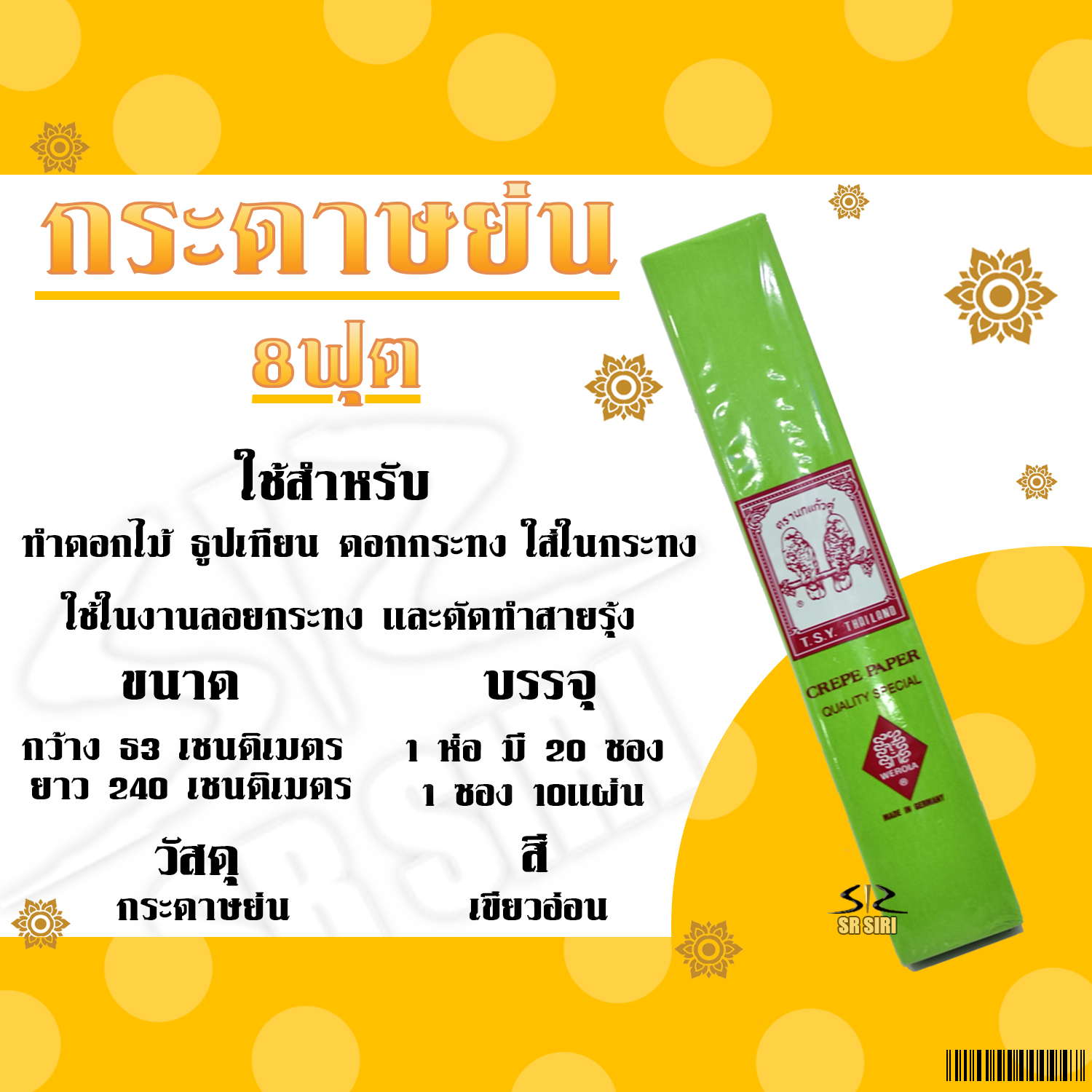 หน้าแรก > กระดาษ > กระดาษย่น 8ฟุต สีเขียวอ่อน 070 1/20ซอง