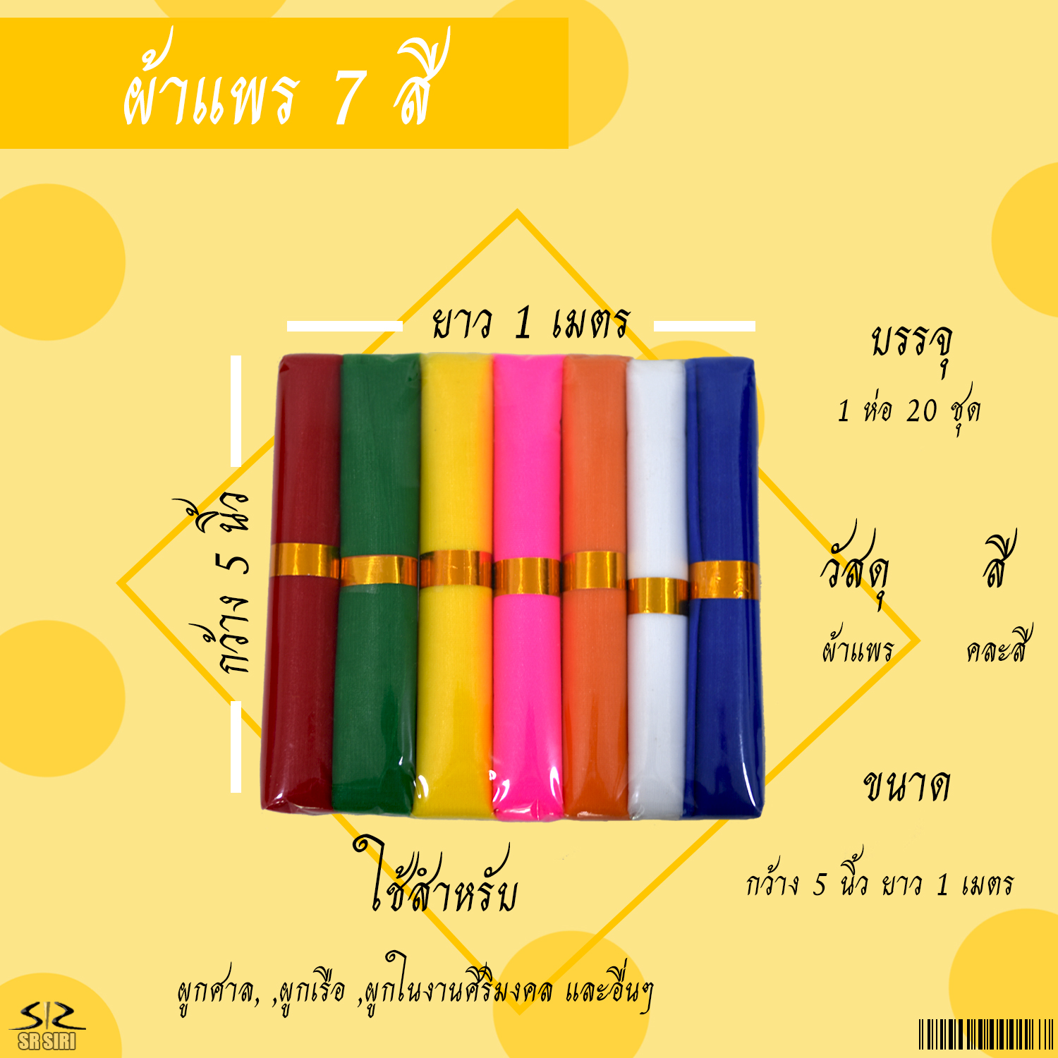 หน้าแรก > ผ้า > ผ้าแพร 7 สี 5นิ้วX1เมตร 1/20