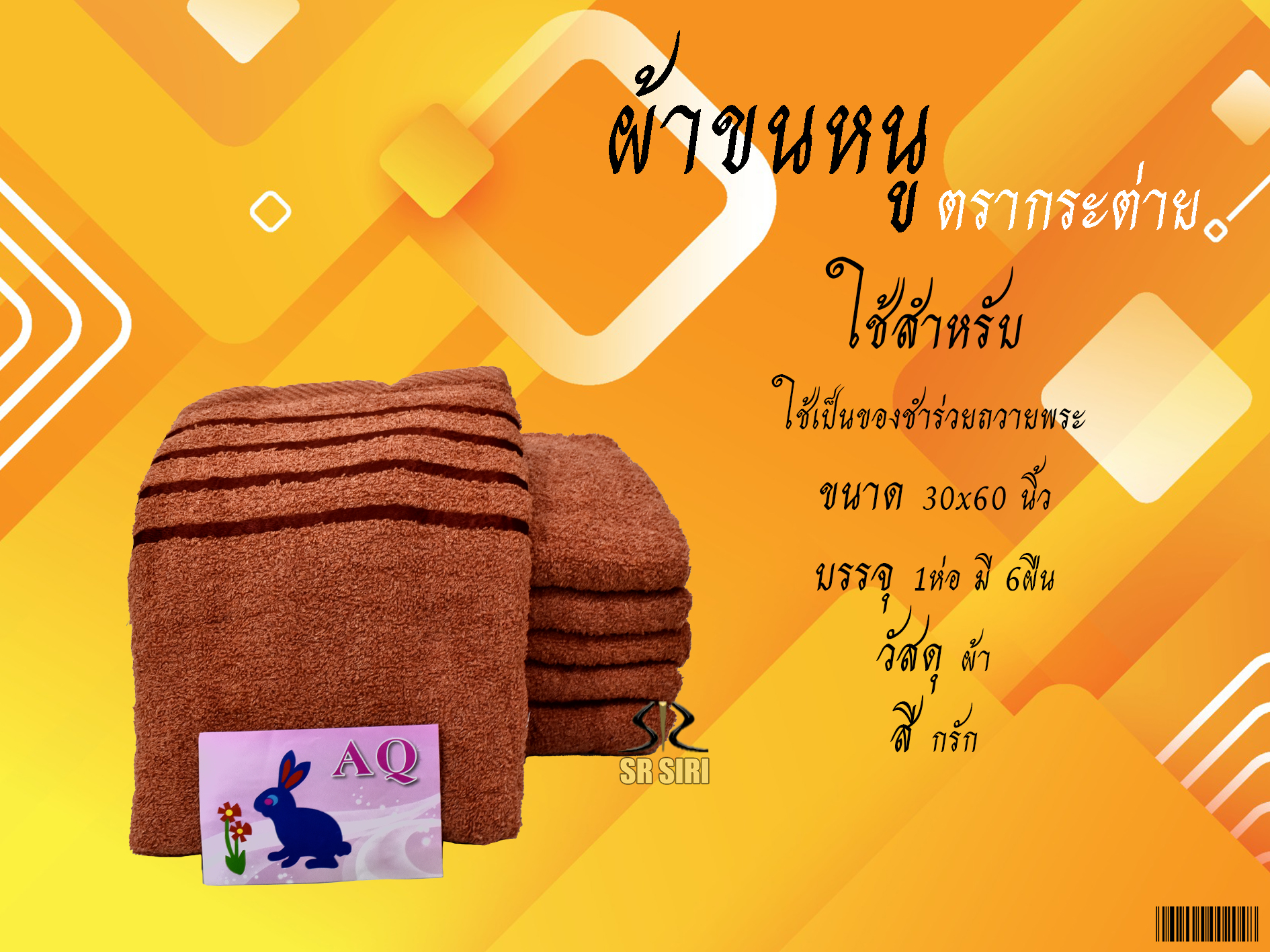 หน้าแรก > ผ้า > ผ้าขนหนู A 30X60 สีกรักดำ 1/6 (ตรากระต่าย)